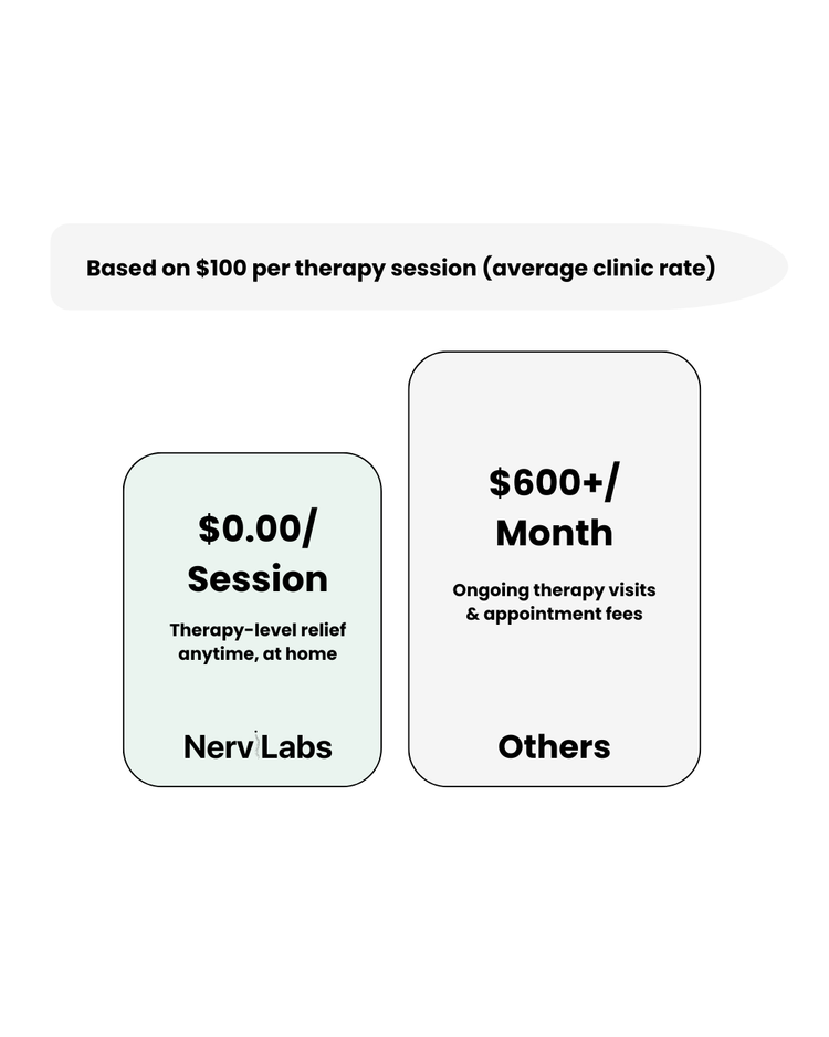 Regular therapy sessions can cost $80–$120 each and most people need 6–8 visits just to feel lasting relief. With NerviLabs, you get the samedeep-tissue comfort and relaxation whenever you need it for less than the price of a single appointment.One-time investment. Lifetime relief.