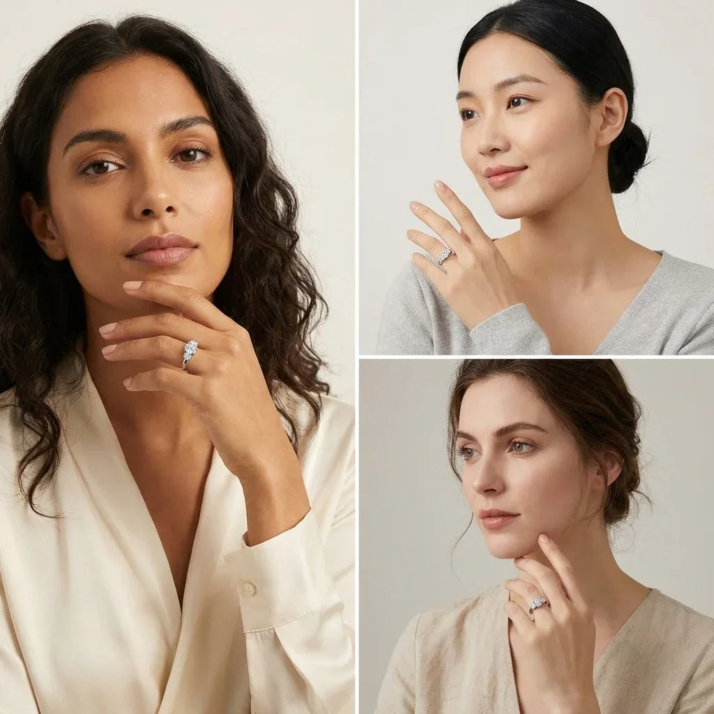 The Trilogy Grand Ring is our most statement three-stone design — a commanding center Moissanite flanked by two perfectly matched side stones, all set in a shared prong setting that keeps every stone elevated and open to light. The result is a ring that reads as an engagement piece, a milestone gift, or simply the most significant thing you've ever put on your finger.